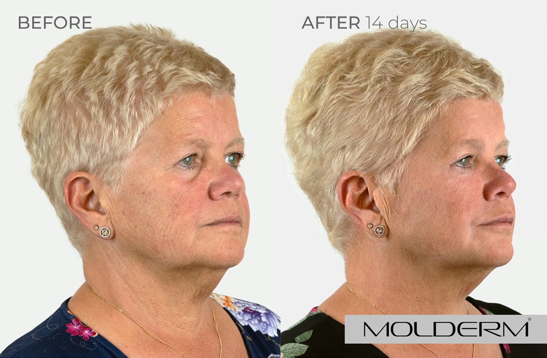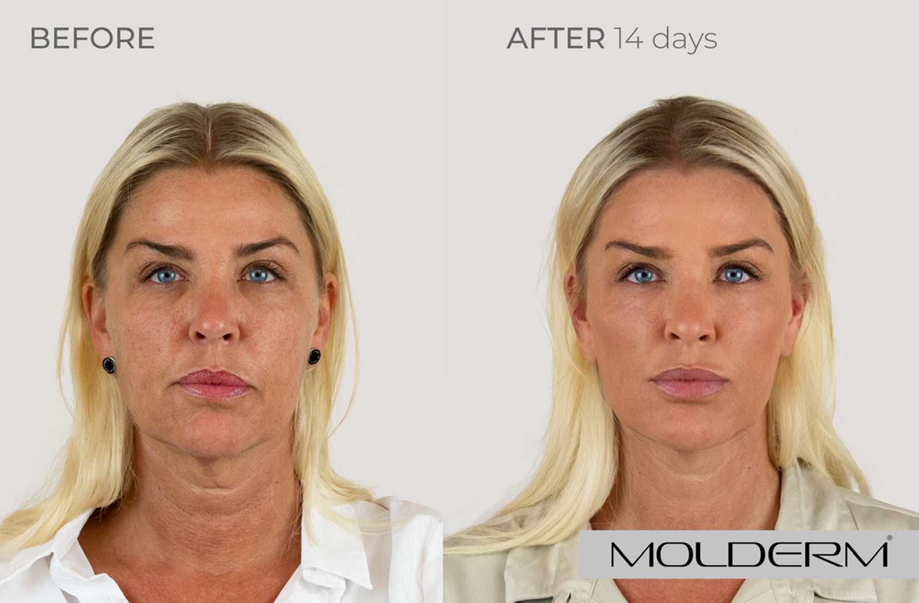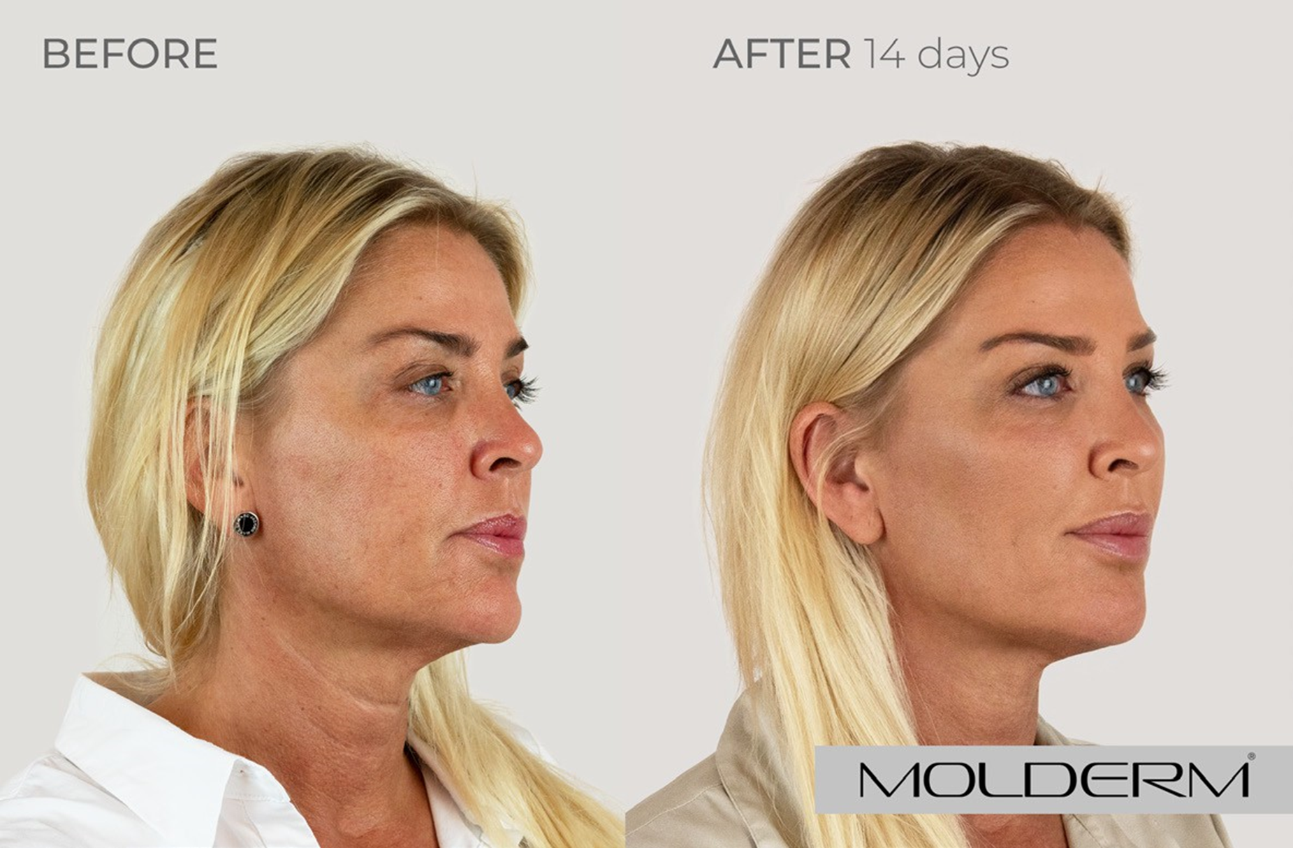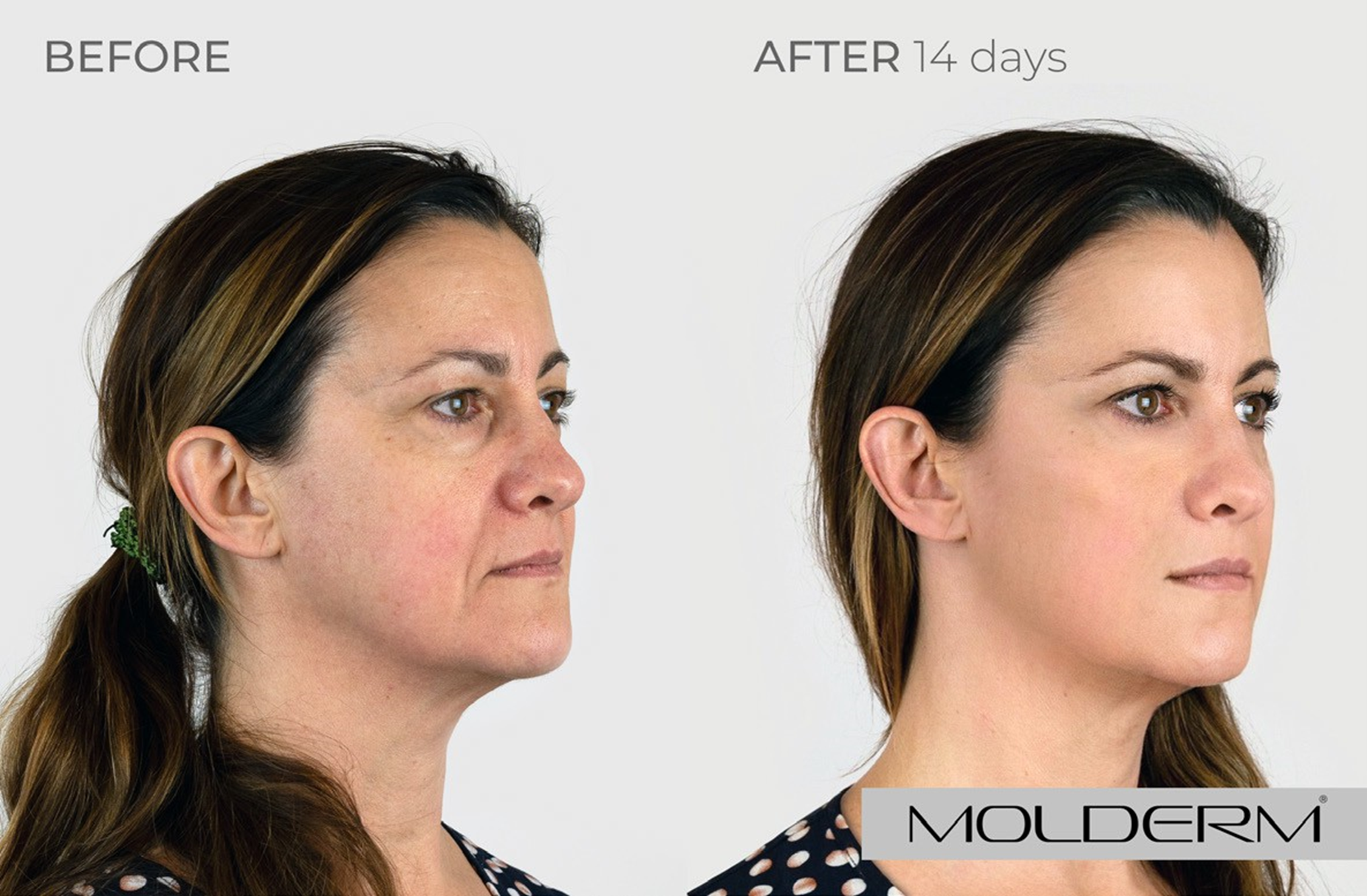 Slzný žlábek: Molderm® TT 1 ml, Tváře: Molderm® Volume 2 ml, Koutky úst: Molderm® Lyft 0,7 ml, Brada: Molderm® Lift 0,3 ml, Marionetové vrásky: Molderm® Lift 1ml, Krk: Molderm® Glow 2 ml