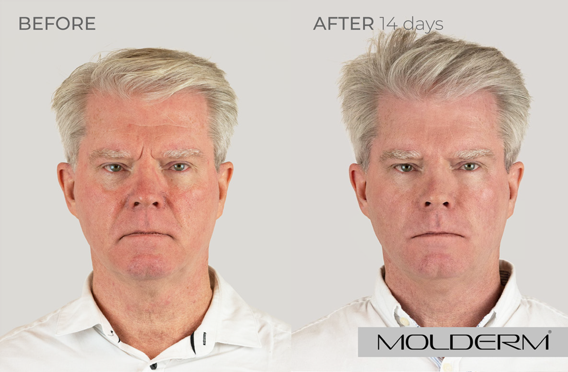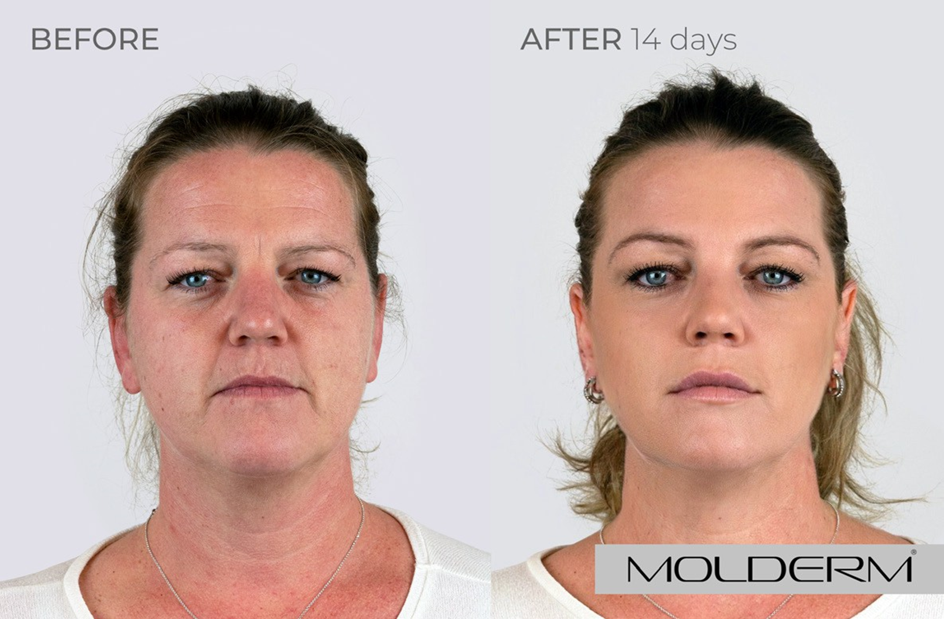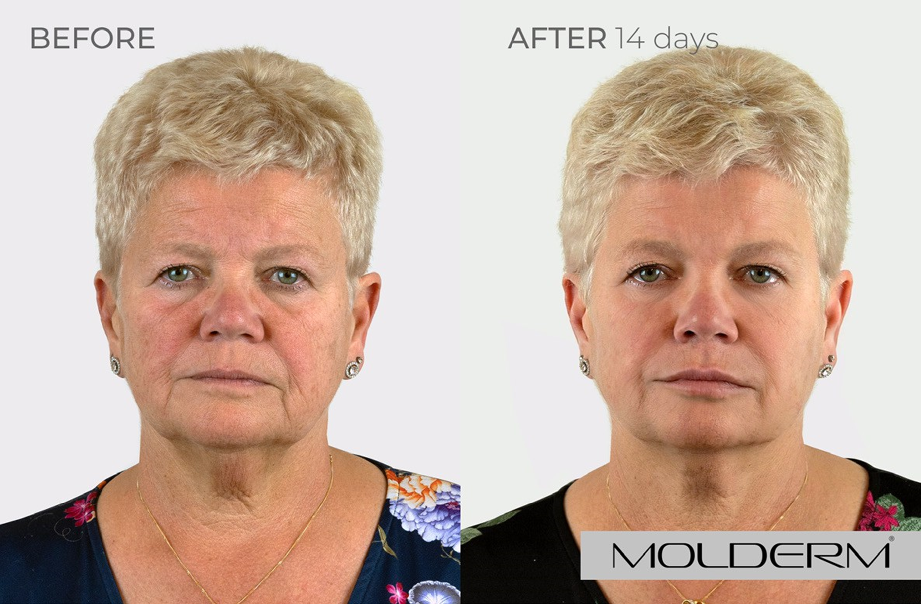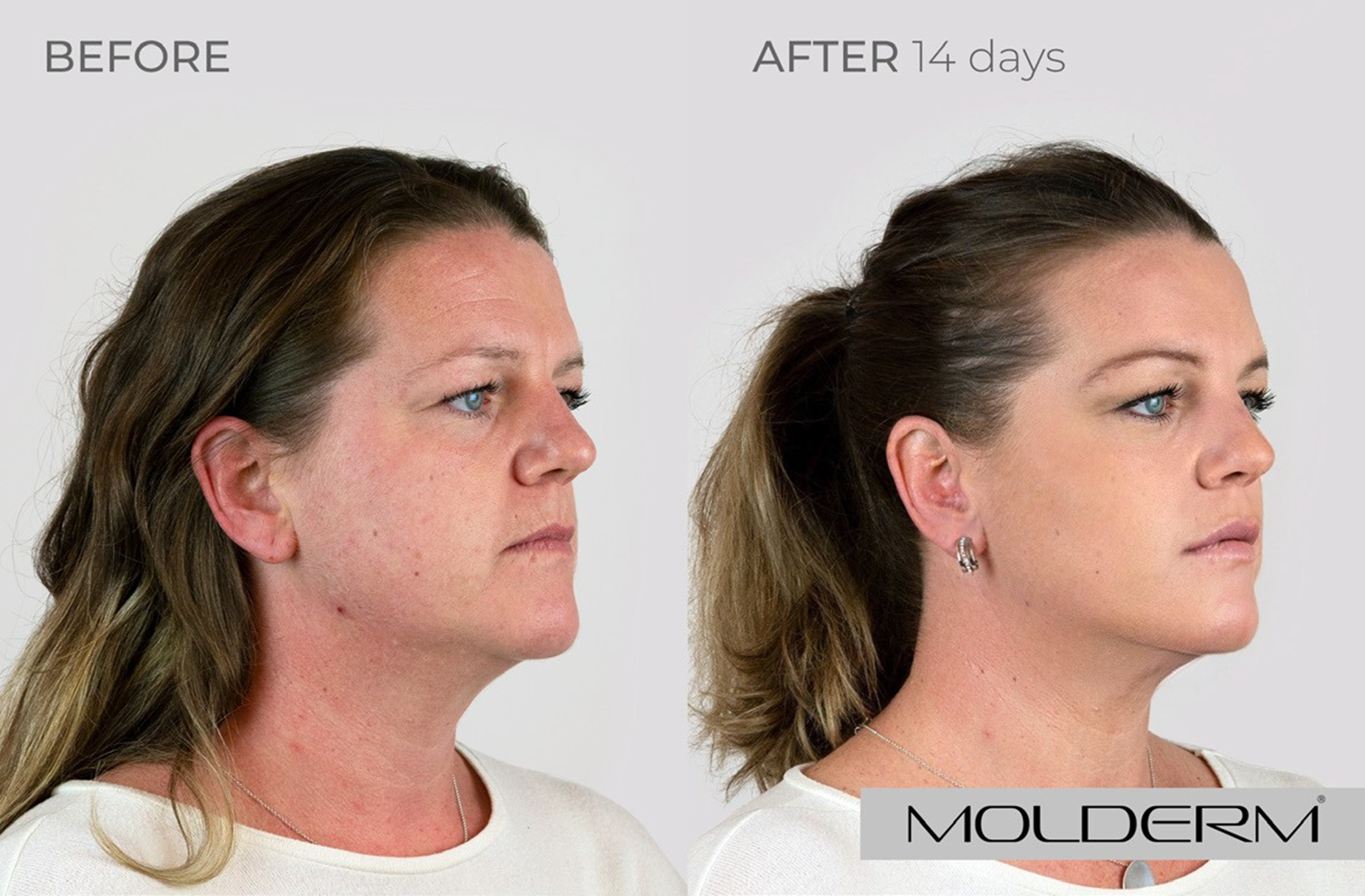Slzný žlábek: Molderm® TT 1 ml, Tváře: Molderm® Volume 2 ml, Koutky úst: Molderm® Lyft 0,7 ml, Brada: Molderm® Lift 0,3 ml, Marionetové vrásky: Molderm® Lift 1ml, Krk: Molderm® Glow 2 ml