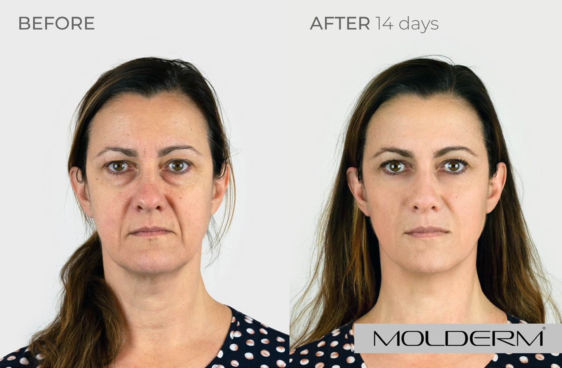 Nasolabiální rýhy: Molderm® Volume 2 ml, Tváře: Molderm® Volume 2 ml, Slzný žlábek: Molderm® TT 0,6 ml, Koutky úst: Molderm® Lift 1,5 ml
